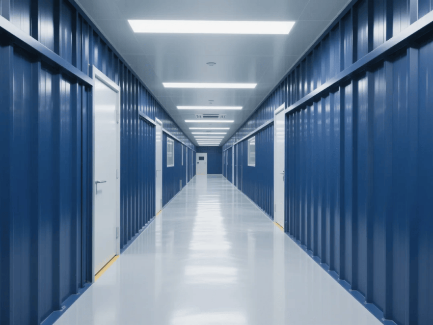 本項目以"未來工業(yè)風(fēng)"為設(shè)計導(dǎo)向,打造符合ISO14644-1Class7標準的智能化生產(chǎn)環(huán)境。空間采用淺灰防靜電環(huán)氧自流平地坪(表面電阻10^6~10^9Ω)與深藍色彩鋼板墻體形成鮮明對比,營造極具科技感的視覺層次。