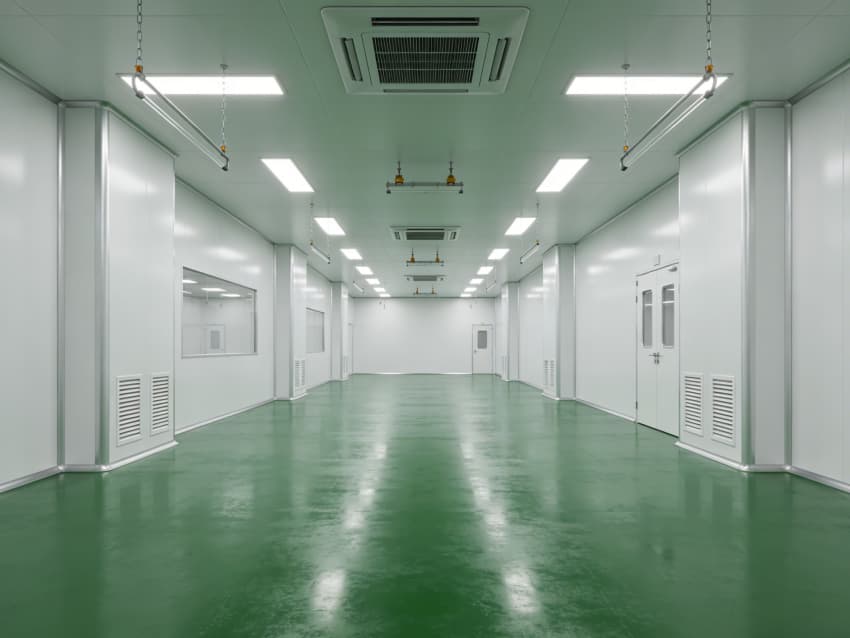 航天航空零件生產(chǎn)車間內(nèi)部施工以“超高精度、極致潔凈、抗擾穩(wěn)定”為核心,采用系列尖端工藝技術(shù),適配精密零件加工的嚴(yán)苛要求,同時實現(xiàn)地面綠色、墻壁白色的統(tǒng)一風(fēng)格。地面采用綠色防靜電耐磨環(huán)氧自流平工藝,經(jīng)基層拋丸強(qiáng)化、高滲透界面劑處理、環(huán)氧砂漿精準(zhǔn)找平、自流平罩面固化四道核心工序,表面平整度誤差控制在0.5mm/m內(nèi),防靜電性能達(dá)10?-10?Ω,抗壓強(qiáng)度超C40,可耐受精密設(shè)備碾壓與切削液侵蝕。