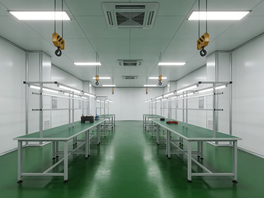 墻面采用白色食品級潔凈抗菌涂層施工,推行無縫拼接與高精度找直工藝,陰陽角采用R50圓弧倒角處理,杜絕積塵死角,涂層附著力達(dá)2.5MPa,硬度≥2H,可耐受高頻次潔凈消殺與工業(yè)粉塵防護(hù)。各功能區(qū)域針對性實施專項工藝:核心加工區(qū)地面增設(shè)多層阻尼減震墊層,采用浮筑地面施工技術(shù),有效隔絕振動干擾;檢測區(qū)墻面做保溫隔熱一體化處理,預(yù)留精密儀器專用管線預(yù)埋孔,確保恒溫恒濕環(huán)境穩(wěn)定;裝配區(qū)采用防靜電接地網(wǎng)格預(yù)埋工藝,保障零件裝配過程靜電安全。