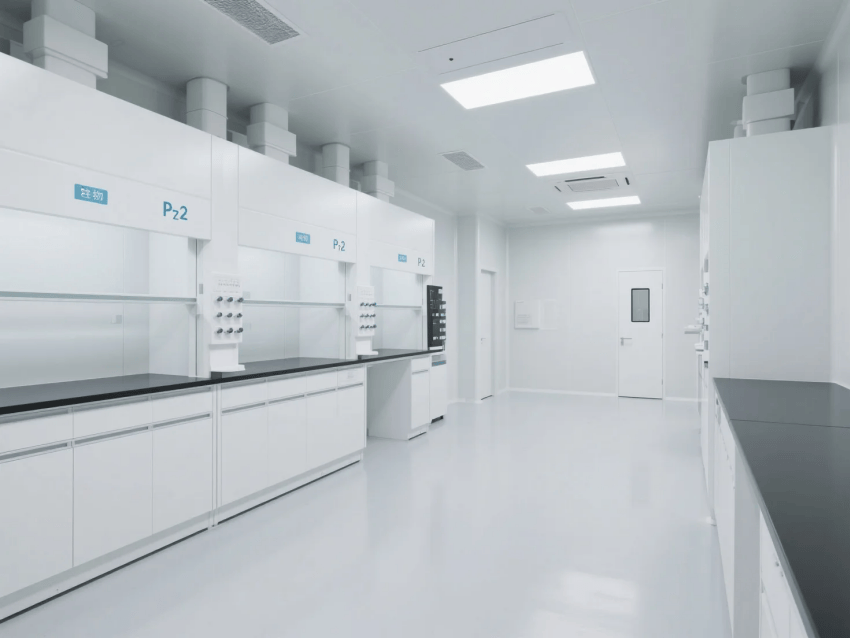 純白實驗臺與灰色儀器設備形成鮮明視覺層次,重點區(qū)域輔以企業(yè)色標識系統(tǒng),在確保生物安全性的同時,呈現(xiàn)現(xiàn)代醫(yī)藥研發(fā)的空間美學。