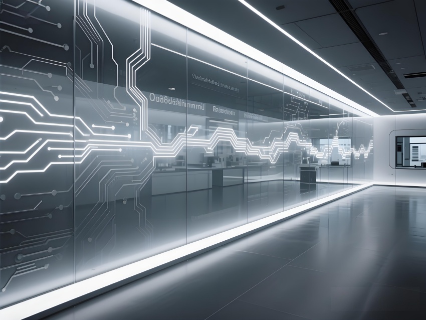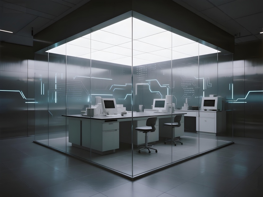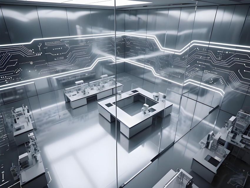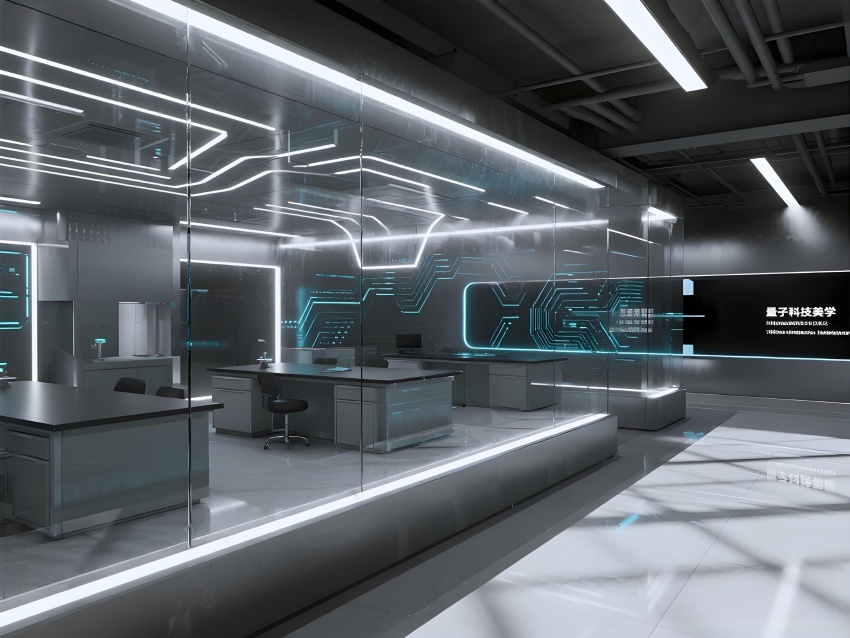 本實驗室采用"量子科技美學(xué)"設(shè)計,將納米尺度的精密感轉(zhuǎn)化為空間敘事。主實驗區(qū)以鏡面銀與深空灰為基調(diào),半透明防輻射玻璃墻體內(nèi)嵌電路板紋理光帶,象征微觀世界的電子軌跡。百級潔凈區(qū)的金色氣流箭頭與千級區(qū)的藍色光暈形成能級躍遷般的視覺分級,CVD設(shè)備艙的蜂窩狀散熱孔與懸浮式控制面板構(gòu)成未來工廠意象。地面導(dǎo)光纖維模擬分子結(jié)構(gòu)網(wǎng)絡(luò),天花板動態(tài)粒子監(jiān)測屏以數(shù)據(jù)流形式投射納米顆粒分布。通過冷調(diào)LED與設(shè)備熒光的層次照明,在滿足EMI屏蔽與化學(xué)防護需求的同時,創(chuàng)造出如同操作量子領(lǐng)域的沉浸式科研環(huán)境,透明氣閘門上的全息警示標志進一步強化尖端材料研究的科技儀式感。