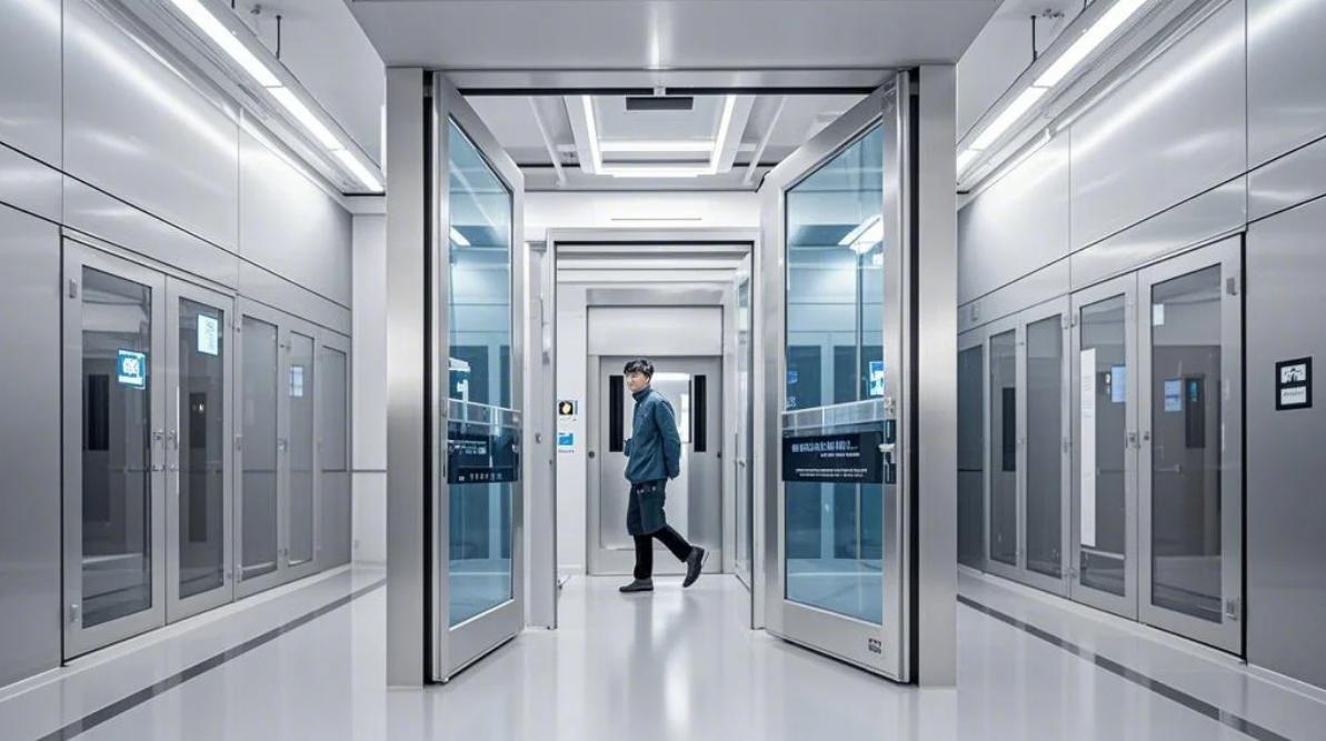 半導(dǎo)體晶圓廠潔凈車間,工業(yè)級(jí)無塵環(huán)境設(shè)計(jì)。更衣區(qū)設(shè)置環(huán)氧樹脂自流平地坪,墻面嵌入正壓送風(fēng)百葉,紫外線消毒衣柜線性排列。風(fēng)淋通道配備360度旋轉(zhuǎn)氣流噴嘴,頂部