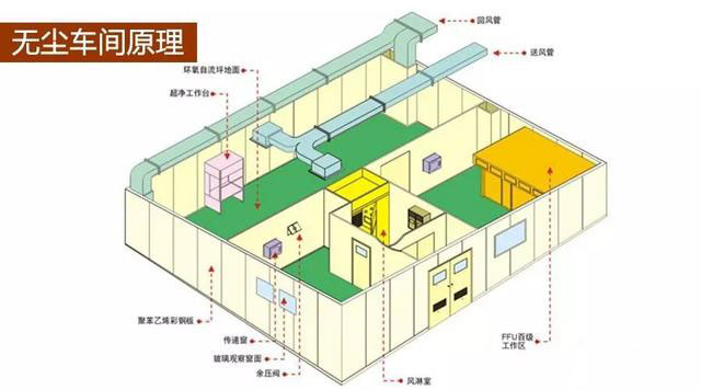 達到要求的這樣一個穩(wěn)定生產環(huán)境即稱為無塵車間,也叫潔凈廠房、潔凈室(Clean Room)、無塵室。無論外部條件怎么變化,其室內均能維持符合原先設定要求的潔凈度、溫濕度及壓力等性能。