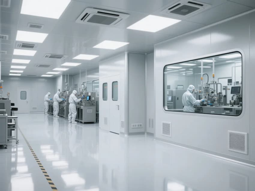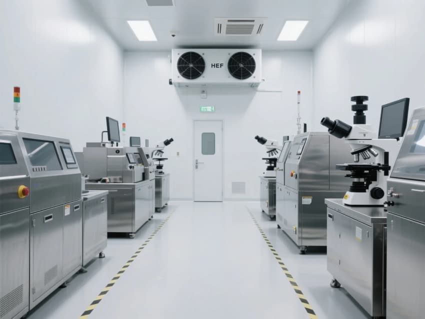 本方案采用"科技極簡主義"風(fēng)格,以ISO 5級(jí)(萬級(jí))潔凈標(biāo)準(zhǔn)為核心。空間設(shè)計(jì)強(qiáng)調(diào)線性流動(dòng)感,灰白主色調(diào)搭配防靜電環(huán)氧樹脂地坪,墻面采用抗菌彩鋼板。頂棚網(wǎng)格化FFU送風(fēng)單元配合側(cè)墻回風(fēng),形成垂直層流。功能分區(qū)明確,包含更衣緩沖間(Class 7)、核心生產(chǎn)區(qū)(Class 5)、設(shè)備維護(hù)通道。智能控制系統(tǒng)集成溫濕度(22±1℃/45±5%)、壓差(+10Pa)、粒子監(jiān)測顯示。創(chuàng)新采用LED黃光照明減少光致氧化,設(shè)備基座增設(shè)主動(dòng)減震系統(tǒng)。設(shè)計(jì)融合人機(jī)工程學(xué),防靜電設(shè)施覆蓋率100%,通過藍(lán)色光帶引導(dǎo)潔凈動(dòng)線,實(shí)現(xiàn)功能性與未來感的完美平衡。