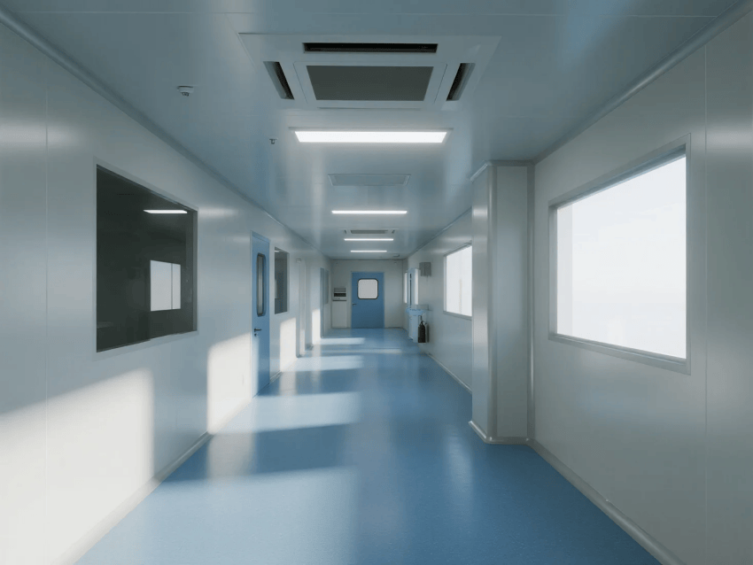圍護(hù)系統(tǒng):50mm厚醫(yī)療級(jí)純白彩鋼板,表面采用納米銀離子抗菌涂層(抗菌率≥99.9%),所有接縫處采用R30mm圓弧一體化處理;