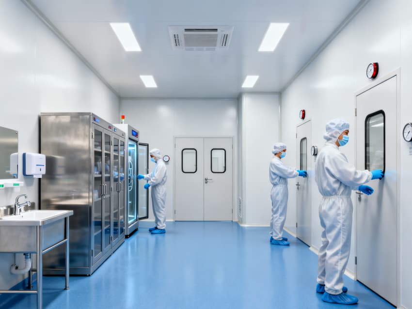 本體外診斷試劑生產(chǎn)廠房統(tǒng)一采用藍(lán)色抗菌潔凈地坪與白色無(wú)縫抗菌墻面,適配試劑研發(fā)、生產(chǎn)、檢驗(yàn)全流程,各車間潔凈度等級(jí)及凈化系統(tǒng)參數(shù)精準(zhǔn)匹配工藝需求。藍(lán)色地面具備耐化學(xué)腐蝕、易消殺特性,白色墻面減少粉塵吸附,為凈化系統(tǒng)高效運(yùn)行奠定基礎(chǔ)。