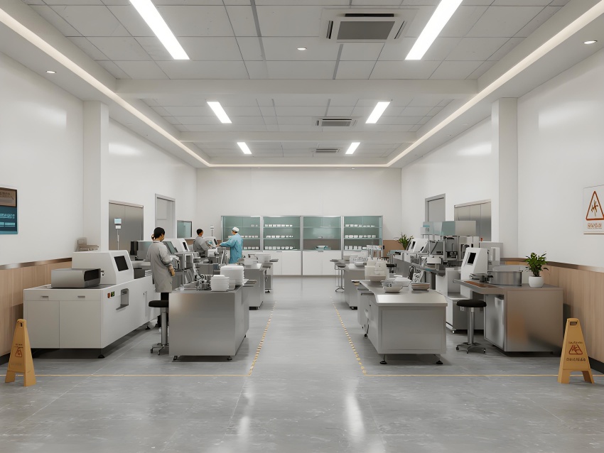本餐具制品車間設(shè)計以現(xiàn)代簡約工業(yè)風(fēng)為核心,融合高效生產(chǎn)與視覺舒適性。色調(diào)以純凈白(墻面)、淺木色(倉儲柜)和不銹鋼銀灰(設(shè)備)為主,營造清爽專業(yè)的氛圍。