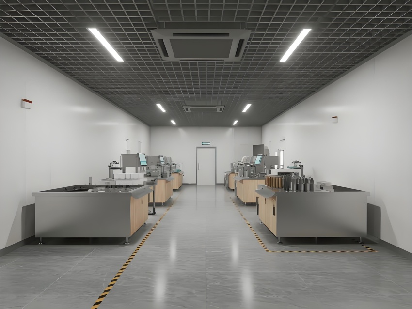 地面采用深灰色環(huán)氧防滑地坪,耐磨抗壓且易清潔;墻面使用白色抗污納米涂層鋼板,無縫拼接避免積灰;頂面設(shè)計為開放式黑色網(wǎng)格吊頂,裸露管線增強(qiáng)工業(yè)感,搭配高效LED條形燈帶提供無影照明。