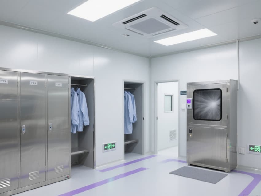 實驗室以銀白色抗菌金屬彩鋼板構(gòu)建墻體與吊頂,搭配淺灰色防靜電環(huán)氧地坪,金屬質(zhì)感與冷色調(diào)結(jié)合,既強(qiáng)化潔凈氛圍,又具備抗腐蝕、易消毒特性。墻面與地面的圓弧過渡設(shè)計消除積塵死角,頂部密布的FFU風(fēng)機(jī)過濾單元形成垂直層流,配合側(cè)下回風(fēng)系統(tǒng),實現(xiàn)每小時25-30次空氣置換,持續(xù)維持室內(nèi)正壓。?