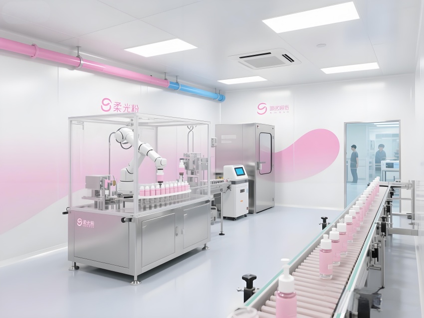 本車(chē)間以“科技感純凈美學(xué)”為設(shè)計(jì)語(yǔ)言,將化妝品行業(yè)的精致基因融入工業(yè)空間。純白主色調(diào)搭配品牌標(biāo)志性的柔光粉點(diǎn)綴,墻面圓弧過(guò)渡的彩鋼板與地面淺灰導(dǎo)靜電地板構(gòu)成潔凈基底。核心灌裝區(qū)透明層流罩內(nèi),機(jī)械臂精準(zhǔn)抓取瓶體灌裝,冷銀色設(shè)備與粉色功能標(biāo)識(shí)形成視覺(jué)對(duì)比。頂棚均勻分布的LED平板燈在乳化區(qū)投下無(wú)影光效,原料輸送管道通過(guò)色環(huán)編碼清晰區(qū)分。質(zhì)檢實(shí)驗(yàn)室的藍(lán)光檢測(cè)儀與包裝區(qū)高速傳送帶上的產(chǎn)品流,共同構(gòu)建高效生產(chǎn)韻律。人員通道的智能風(fēng)淋室采用漸變色玻璃,科技感與人性化并存。整體空間通過(guò)嚴(yán)格的功能分區(qū)與柔和的色彩管理,打造符合國(guó)際標(biāo)準(zhǔn)的化妝品智造殿堂。