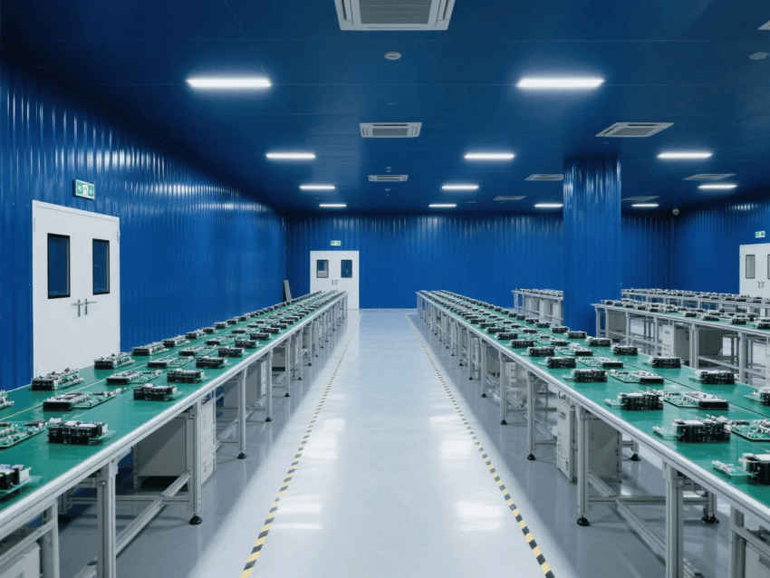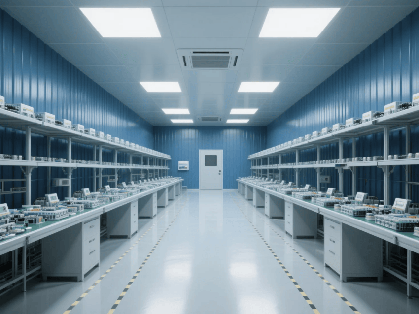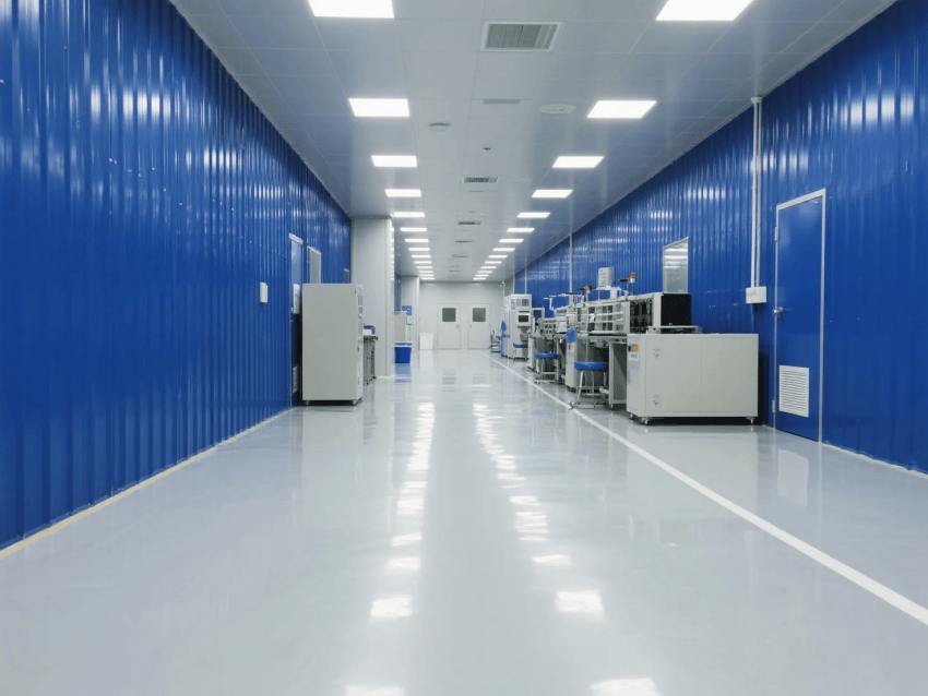 本工程嚴格遵循ISO14644-1Class8標準,采用"工業(yè)科技風(fēng)"設(shè)計理念,打造現(xiàn)代化電子零件制造環(huán)境。車間以深藍彩鋼板墻體與淺灰防靜電環(huán)氧地坪形成鮮明視覺對比,營造兼具科技感與功能性的生產(chǎn)空間。