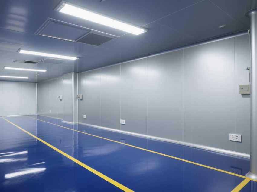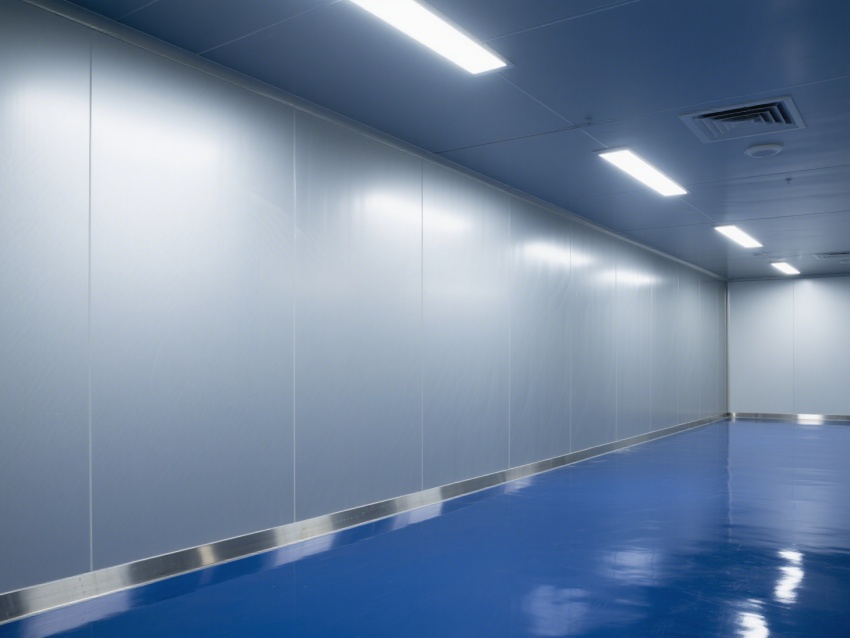 車間內(nèi)部整體呈銀灰色和藍色,給人一種現(xiàn)代感和科技感。墻面、地面和天花板均采用無縫設計,便于清潔和消毒,防止灰塵和微粒的積聚。照明系統(tǒng)明亮且均勻,提供了良好的工作環(huán)境。