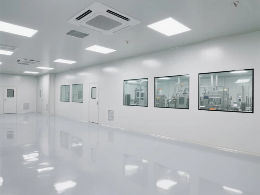 該潔凈車(chē)間采用國(guó)際標(biāo)準(zhǔn)的萬(wàn)級(jí)無(wú)塵環(huán)境設(shè)計(jì),以高級(jí)灰與純白為主色調(diào),營(yíng)造出嚴(yán)謹(jǐn)、高效的工業(yè)美學(xué)。墻面采用抗靜電金屬夾芯板,表面經(jīng)納米涂層處理,兼具防塵與耐腐蝕性能。防靜電環(huán)氧樹(shù)脂地坪無(wú)縫鋪設(shè),電阻值嚴(yán)格控制在10^6~10^9Ω,確保精密電子元件生產(chǎn)過(guò)程中的靜電防護(hù)。
