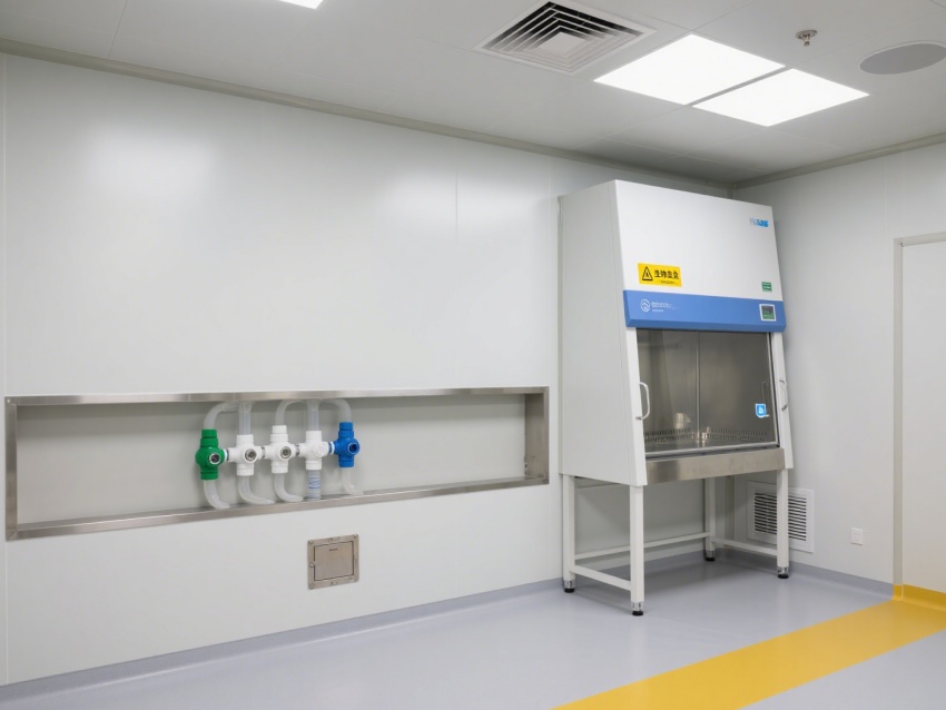 內(nèi)部設(shè)施專業(yè)且完善,生物安全柜為實(shí)驗(yàn)操作提供無(wú)菌防護(hù);各類氣路、水路接口布局規(guī)范,滿足檢測(cè)過程的資源供應(yīng);配備應(yīng)急沖眼設(shè)施與生物危害廢液處理區(qū),保障實(shí)驗(yàn)安全。空間設(shè)計(jì)注重潔凈與防護(hù),墻面、地面為無(wú)縫抗菌材質(zhì),便于消毒滅菌,黃色警示線清晰劃分功能區(qū)域,各類監(jiān)控儀表實(shí)時(shí)顯示溫濕度、壓差等關(guān)鍵參數(shù),確保實(shí)驗(yàn)環(huán)境穩(wěn)定可控。