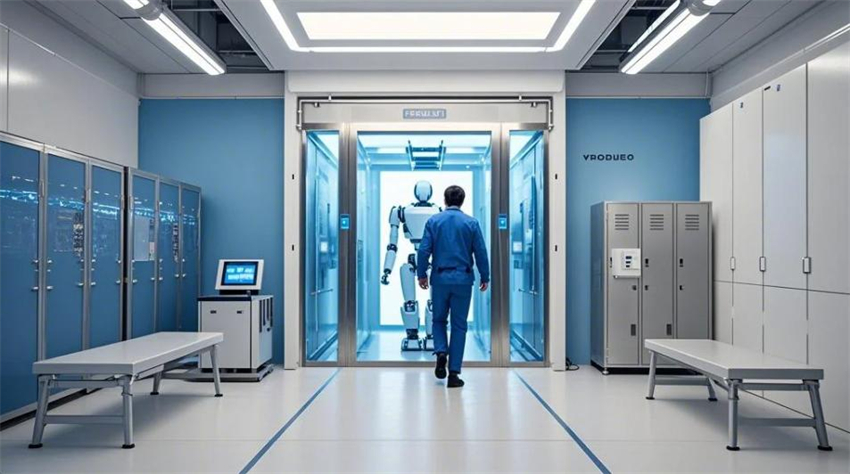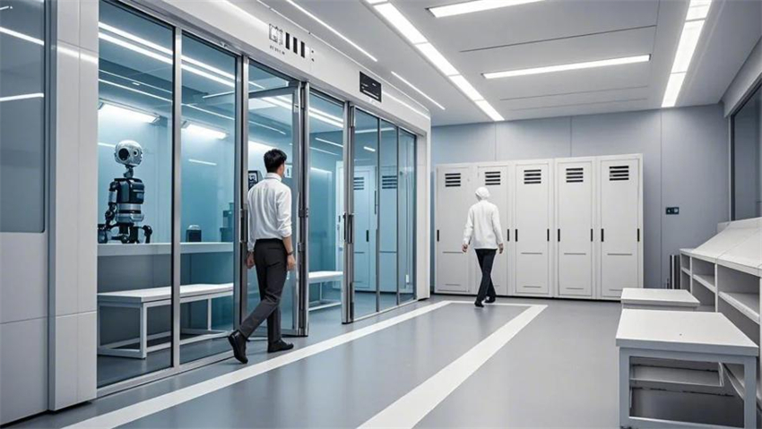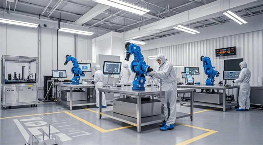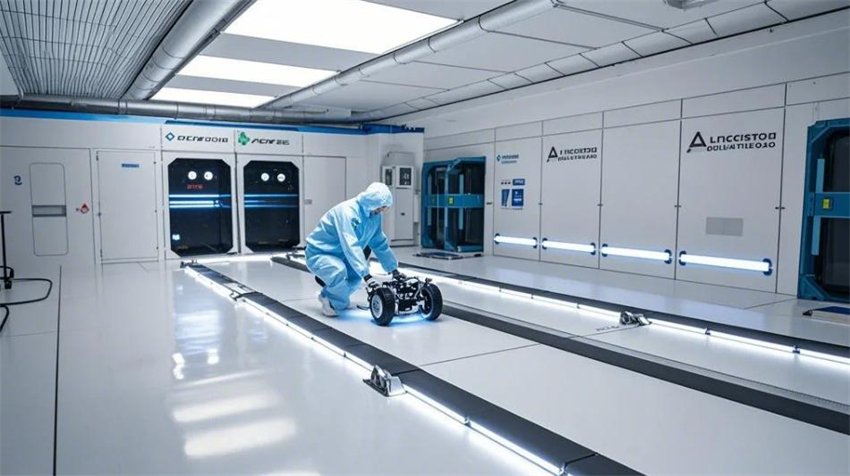 機(jī)械人研發(fā)實驗室,未來科技風(fēng)格。實驗室分為研發(fā)區(qū)、測試區(qū)、裝配區(qū)和辦公區(qū)。研發(fā)區(qū)占50%,測試區(qū)占30%,裝配區(qū)占10%,辦公區(qū)占10%。研發(fā)區(qū):防靜電環(huán)氧地坪(淺灰色),白色彩鋼板墻面和天花板,頂部高效過濾器(HEPA),不銹鋼工作臺,機(jī)械人原型和3D打印機(jī)排列整齊。測試區(qū):機(jī)械人測試平臺,地面為防靜電PVC地板(淺色)。裝配區(qū):工具架整齊,機(jī)械人部件分類存放。辦公區(qū):玻璃隔斷,現(xiàn)代簡約辦公桌。整體色彩:白色、淺灰色、科技藍(lán)點(diǎn)綴。
