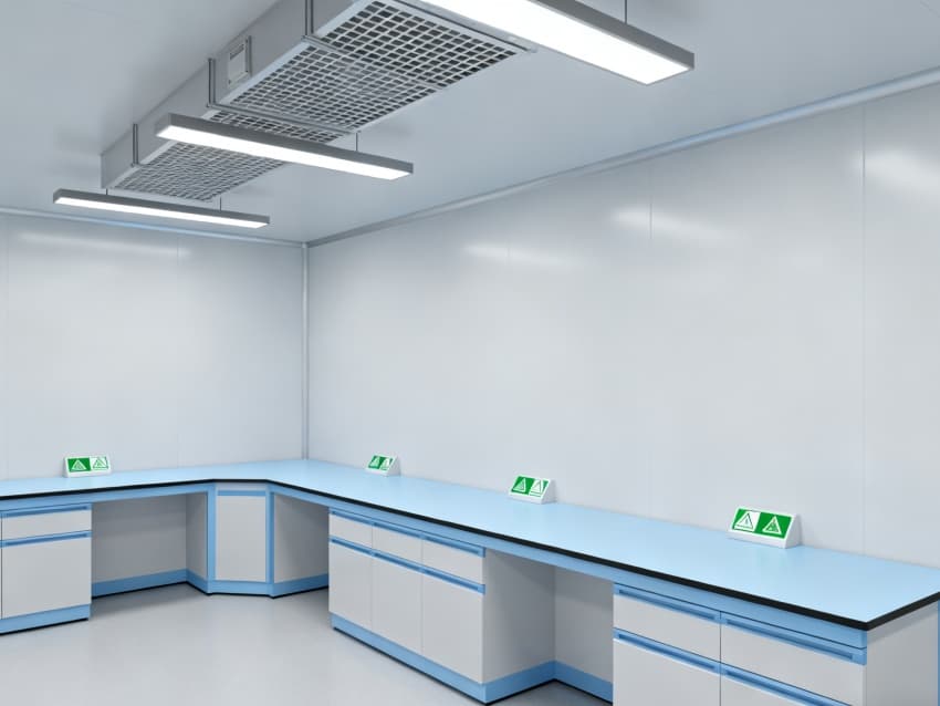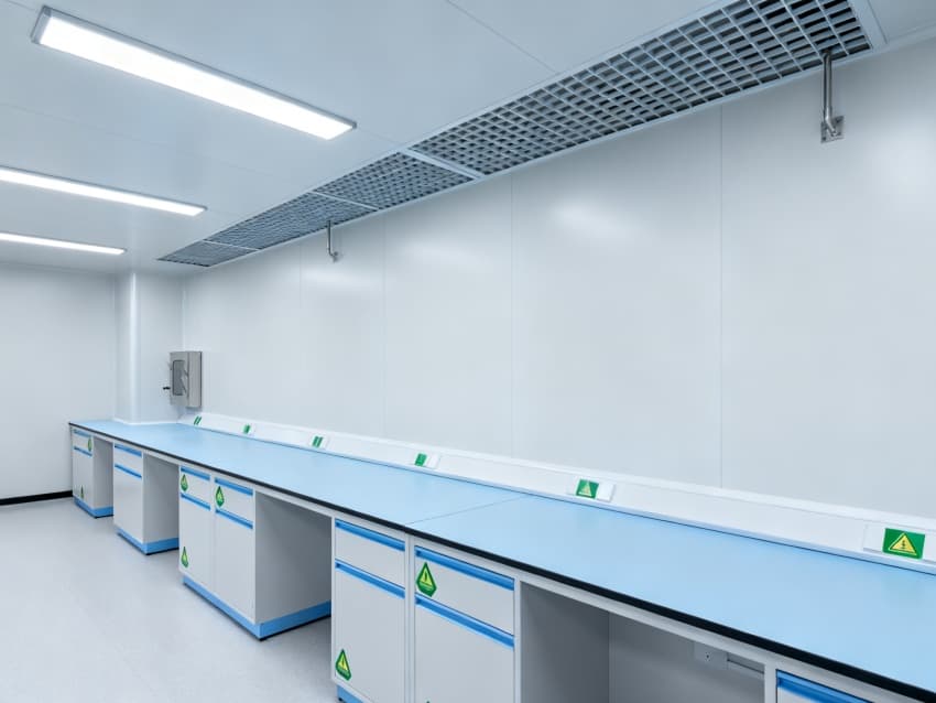 在核心操作區(qū)域,我們執(zhí)行的是高標(biāo)準(zhǔn)的潔凈要求,每立方米空氣里直徑0.5微米以上的灰塵、顆粒等雜質(zhì)不能超過352000個,相當(dāng)于達(dá)到了萬級潔凈標(biāo)準(zhǔn)(國際ISO8級)。而像走廊、儲物間這些輔助區(qū)域,要求會稍微低一些,執(zhí)行的是十萬級潔凈標(biāo)準(zhǔn)(國際ISO9級)。采用初效-中效-高效三級空氣過濾系統(tǒng),配合側(cè)送頂回氣流設(shè)計,實現(xiàn)每小時18-22次空氣置換;墻面選用耐酸堿潔凈彩鋼板,地面為防滑PVC無菌卷材,所有邊角做圓弧密封處理,減少清潔死角。室內(nèi)溫度穩(wěn)定在22±2℃,相對濕度控制在45%-55%,關(guān)鍵實驗區(qū)維持微正壓,有效隔絕外界污染與交叉感染,既符合高校生物實驗教學(xué)規(guī)范,也為科研數(shù)據(jù)準(zhǔn)確性提供可靠環(huán)境保障。